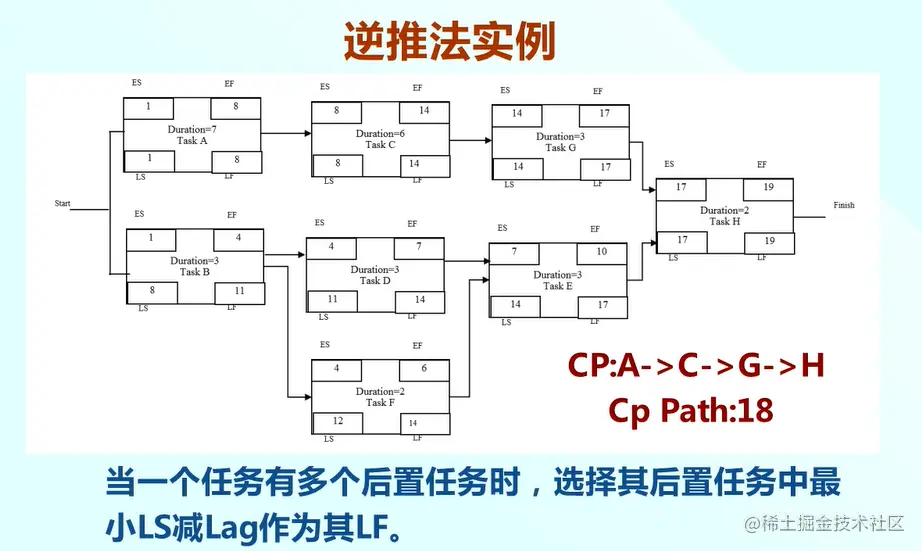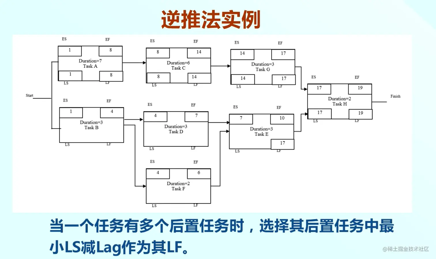 H的最晚结束时间为19,所以LS=17。则前置任务G的LF=17,LS=14,以此类推…自上而下,从右到左。