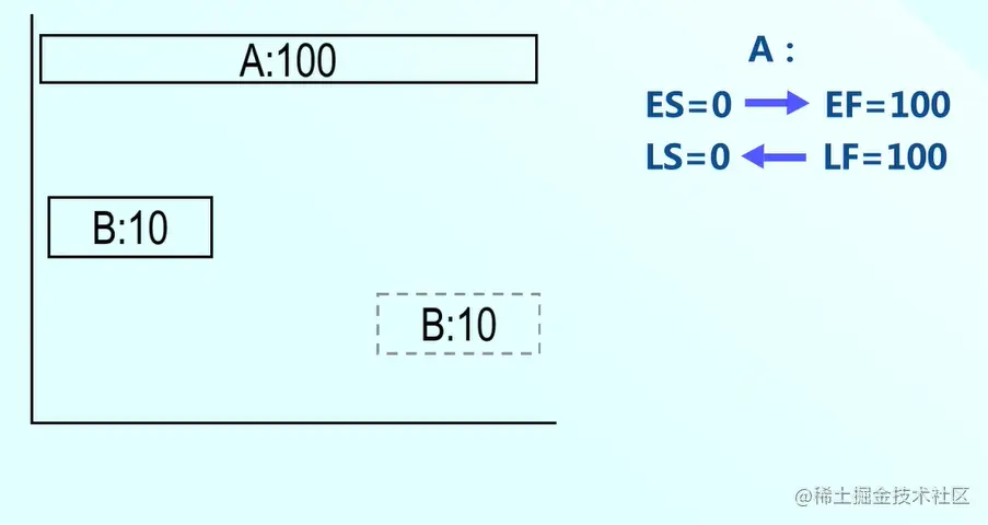 所以ES=0可以推导出EF=100,从左向右,顺时针推导。A的最晚完成时间是第100天,历时是100,所以LF=100,LS=0,从右向左,逆时针推导。