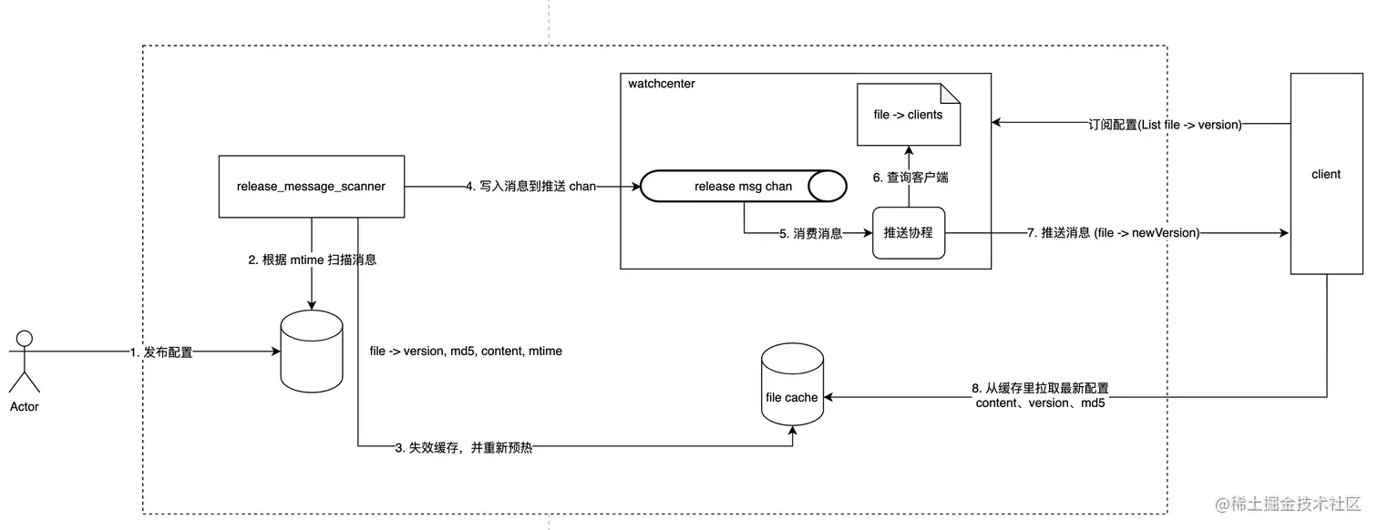 file, version, content, mtime - 每个北极星服务端实例,都会定时1s扫描配置发布表,根据 mtime 捞出最近 1s 内变更过的数据