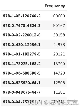#数据集中购买最多的前10本书top0 = pd.DataFrame(dt2.value_counts(sort= True, ascending=False).head(10))to10