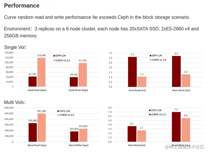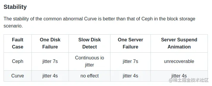 得益于 Raft 一致性协议及创新架构的技术路线,目前,无论采用 SATA SSD 块存储,还是 NVMe 块存储,Curve 的随机读写、延迟性能都远优于老牌开源存储系统 Ceph,异常状态下的性能稳定性同样有接近倍半关系的领先程度。