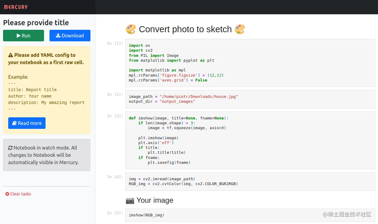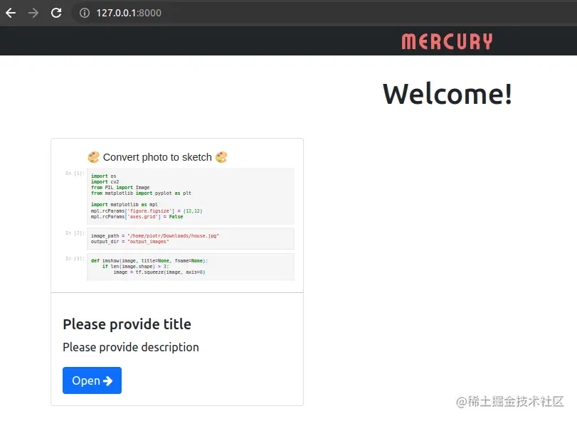 这就用到前面安装的工具包mercury,前面 已经介绍,它可以将Jupyter Notebook转化成网页应用。