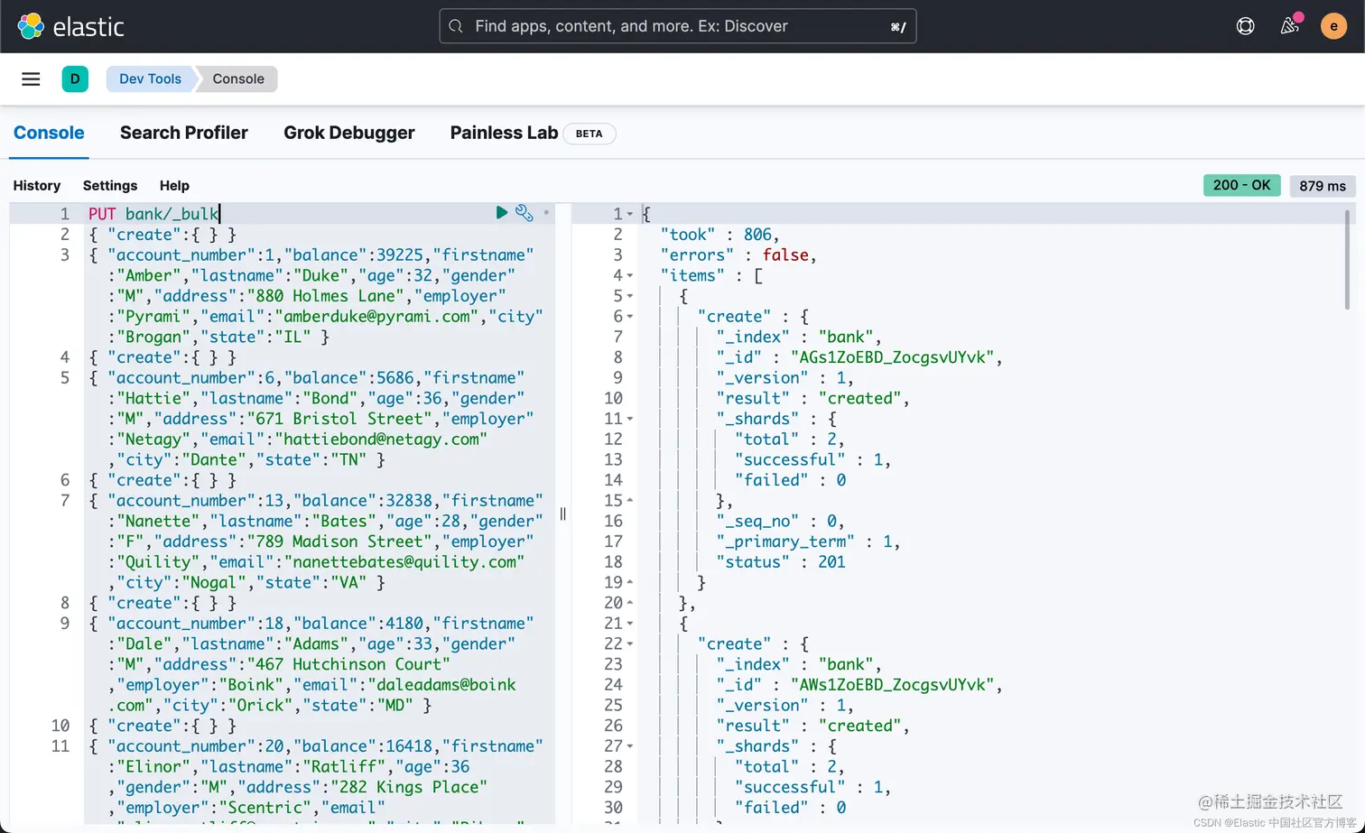 当我们执行完上面的指令后,我们就可以看到一个被创建的索引 bank,并且它里面含有 10 个文档: