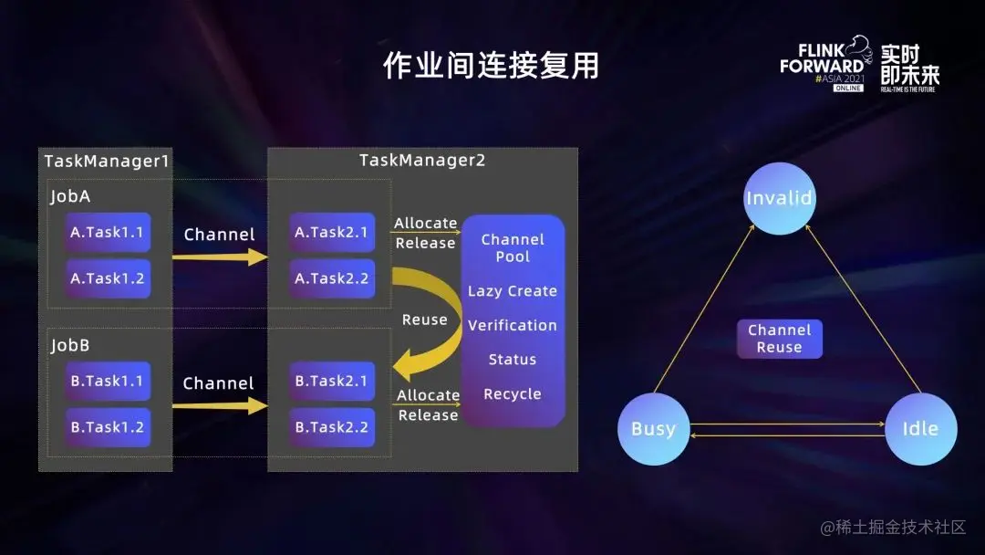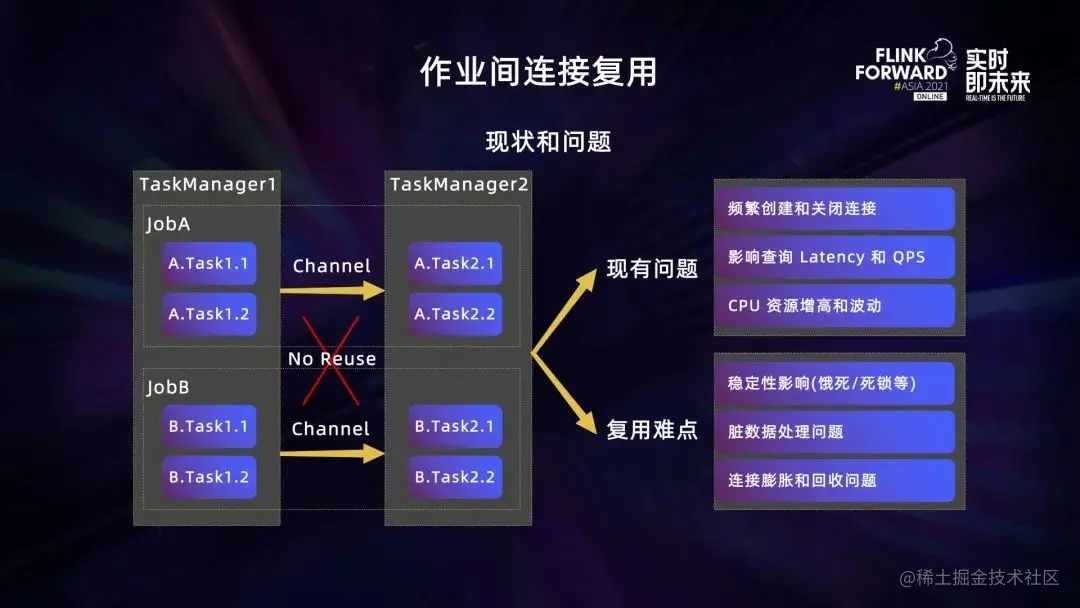 - 稳定性问题。Channel 不仅用来做数据传输,而且还与计算任务的反压相关,所以直接复用网络连接可能会导致计算任务饿死以及死锁等问题;