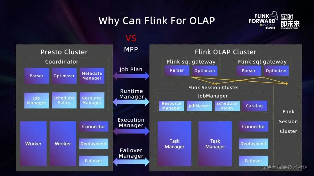 - OLAP 最大的特点是查询作业对 Latency 和 QPS 有要求的,需要保证作业在 Latency 的前提下提供比较高的并发调度和执行能力,这就对 Flink 引擎提出了一个新的要求。