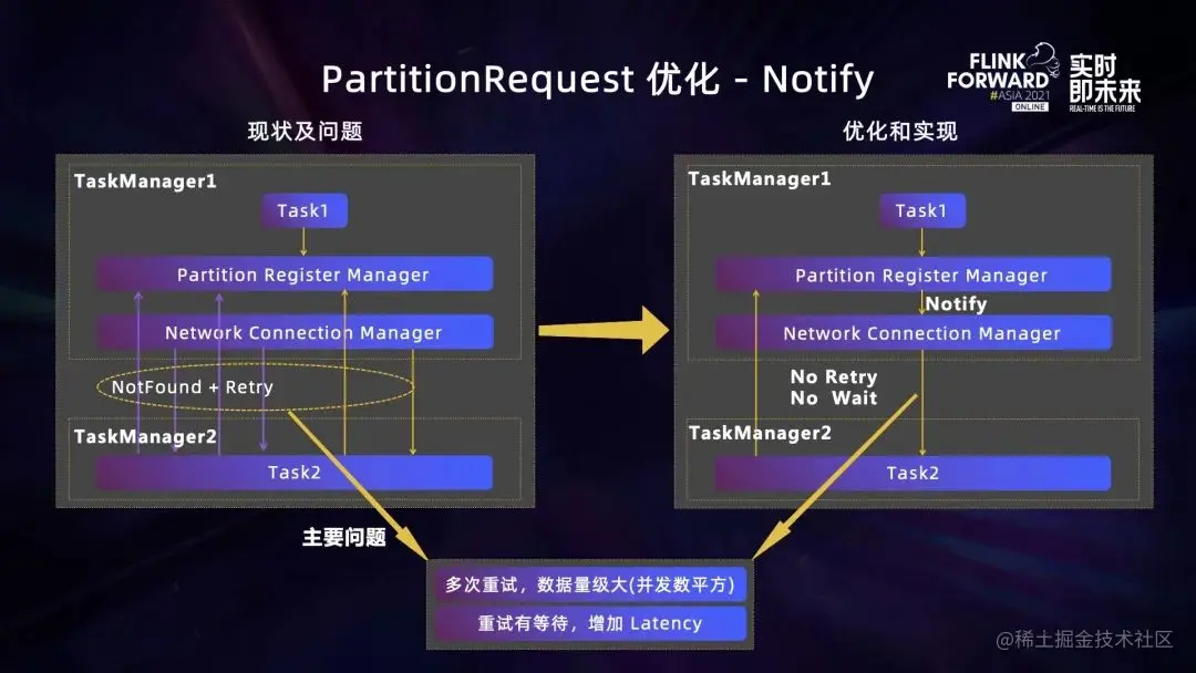 这个过程存在两个问题,一个是 Partition Request 数量过多,另外一个是下游的计算任务在轮询重试的过程中有时间差,导致计算任务的 Latency 加大。所以我们为上下游计算任务交互实现了一个 Listen+Notify 机制。上游的 TaskManager 接受到下游计算任务发送的 Partition Request 时,如果上游的计算任务还未部署,则会将 Partition Request 放入到一个 Listen 列表里,计算任务部署完成再从计算队列里面获取 Partition Request ,并且回调执行完成整个交互。