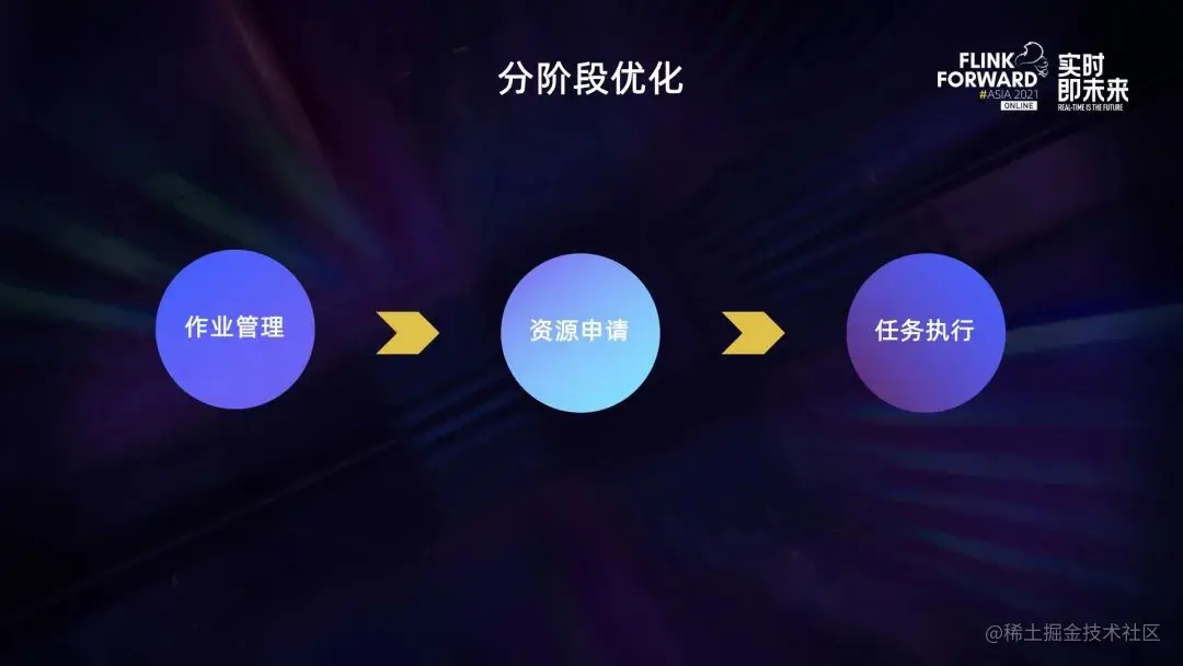 针对 Flink 并发作业调度的性能问题,我们也曾尝试针对一些性能的瓶颈点进行简单的优化,但效果并不理想。所以我们针对 Flink 作业的调度执行全链路进行了分析,将 Flink 作业的执行分为作业管理、资源申请、计算任务三个主要阶段,随后针对每个阶段进行了相应的性能优化和改进。