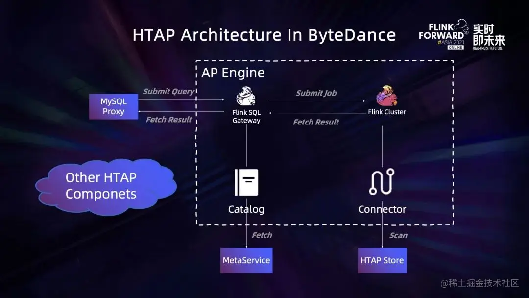 HTAP 系统对外支持 MySQL 协议,MySQL Proxy 接收到查询后根据查询的复杂度和特点(是否使用索引等),将查询分发给 TP 或者 AP 计算引擎。Flink SQL Gateway 是 AP 计算引擎的查询入口,接收到 AP 查询后生成 Flink 作业执行计划,并提交到 Flink 集群调度和执行。AP 计算引擎有一个列式存储,Flink 集群通过 Catalog 和 Connector 的接口,分别与存储层的元信息和数据查询接口进行交互。AP 计算引擎完成计算后,Client 端会向 Flink Gateway 发起读取结果数据请求,Gateway 再向 Flink 集群读取结果数据,所有结果数据返回给 Client 后作业就完成了整个 AP 计算流程。