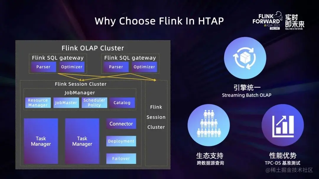 架构上,在 K8s 上拉起 Flink 的 Session 集成,这是一个非常典型的 MPP 架构;