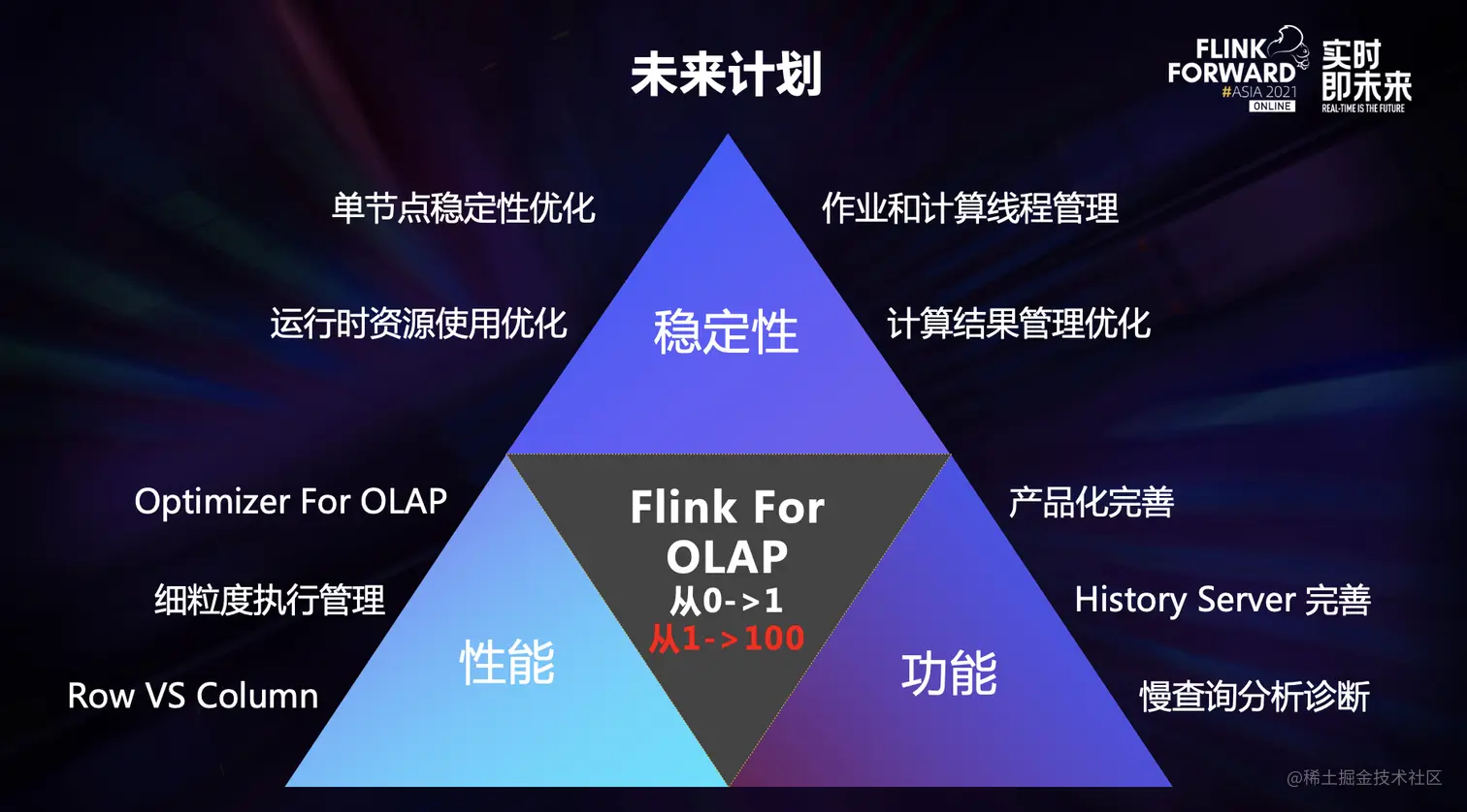 现在 Flink OLAP 虽然在实际业务场景中已经投入使用,但在很多方面还需要继续打磨和优化,我们将这块主要分为三大部分:稳定性、性能和功能。