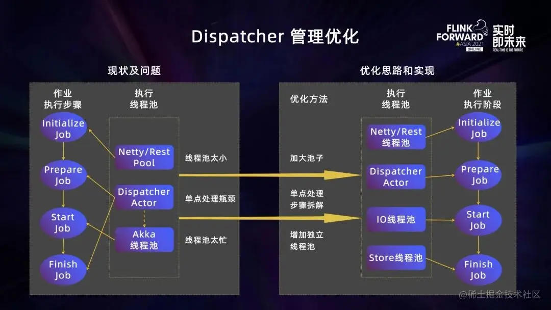 - 对作业管理流程进行拆解,创建了两个独立的线程池:IO 线程池和 Store 线程池,分别负责执行作业管理过程中比较重量级的操作,减轻 Dispatcher Actor 和 Akka 线程池的工作压力。