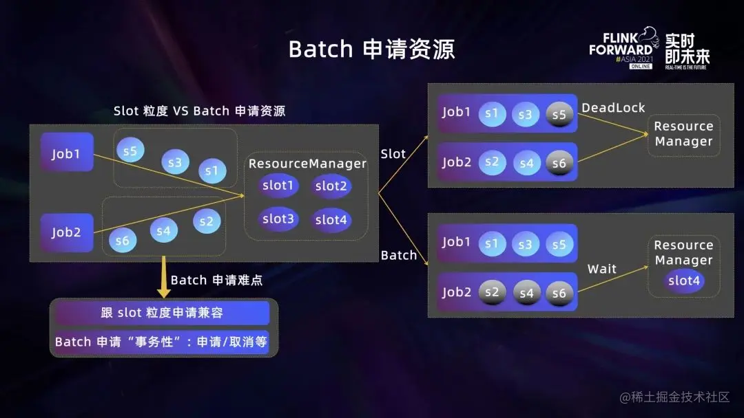 针对这个问题,我们选择将资源申请从 Slot 粒度优化为作业 Batch 粒度,每个作业会将它的资源申请打成 Batch 一次性申请。作业 Batch 粒度的资源申请主要需要解决两个难点: