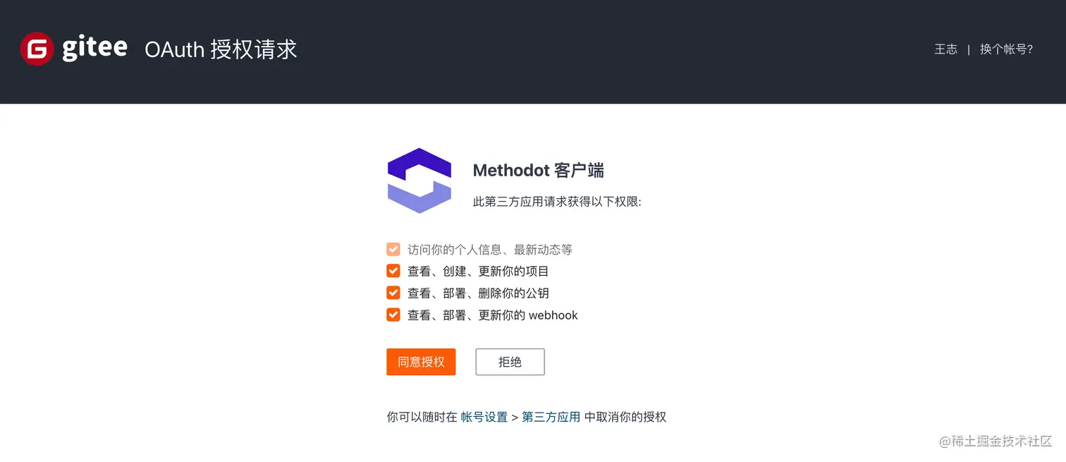 在设置代码源中选择 Gitee,点击绑定账号,此时系统会跳转至 Gitee 的绑定界面,选择全部权限后点击 同意授权 即可(如果您有多个 Gitee 账号,记得检查下绑定的账号是否正确):