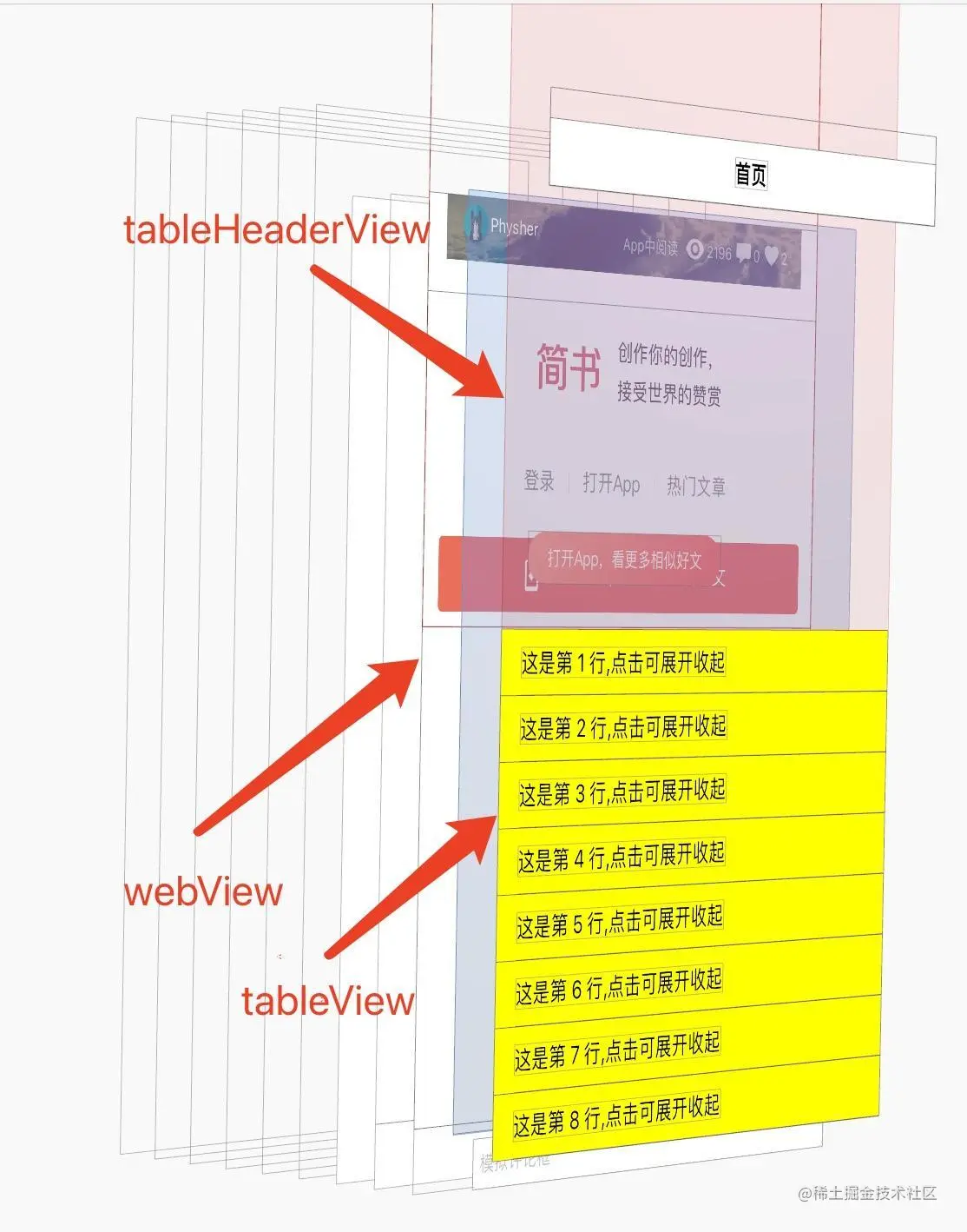 这也是大多数开发之类需求第一个想到的方案,简单粗暴,关闭WKWebView的scrollEnabled属性后直接把tableView.tableHeaderView = webView,待webView加载完成后,将tableView的tableHeaderView的高度设置成webView.scrollView.contentSize,这里引用@xuning0 文章中的图作为演示