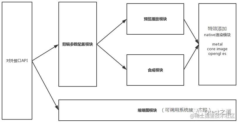 编辑SDK的核心模块包括时间线、特效指令、预览播放器、合成器。整体架构图概括如下: