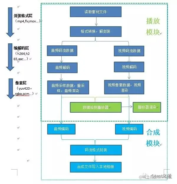 实际上,播放和合成模块是分立的两个模块,并非涵盖关系。只不过两个模块读取文件配置信息和音视频解码部分流程相同。另外,在添加文件时,SDK会对文件进行格式转换,方便之后对于音、视频数据的处理。读取文件并解码后,还会涉及到视频像素数据的颜色空间转换。由此,也需要我们在测试过程中对相关知识进行学习了解,譬如常见的音视频文件格式,视频数据的颜色空间等。