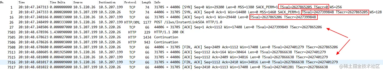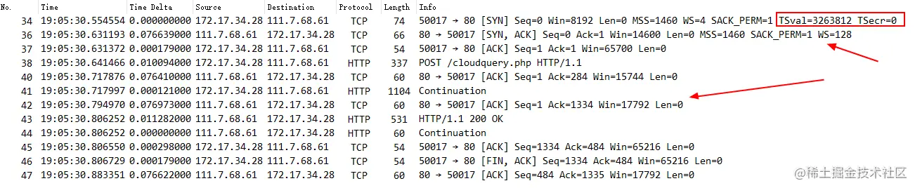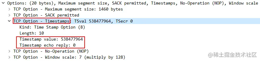 TSOPT 值仅在客户端和服务器两端均支持该选项的情况下,才会在会话中一直携带。上述客户端关闭选项的情况下,则服务器因此也不会发送带有 TSOPT 的数据包 。