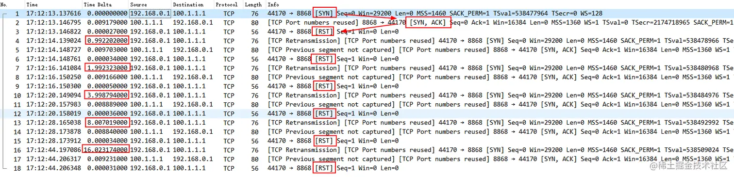 - 服务器能正常返回 SYN/ACK,排除服务端口未打开问题;