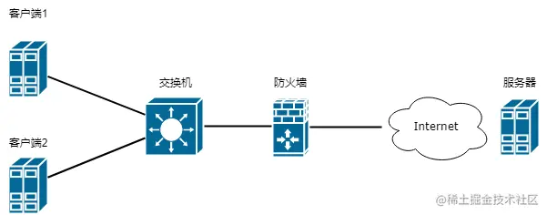 首先简单了解下网络拓扑,内网环境有多个客户端,通过防火墙出互联网访问服务器。
