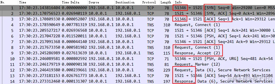 正常情况下的连接,以 TCP 三次握手建连开始,IRTT 约 27ms,通过 Oracle TNS 协议进行交互,基本以 Request 和 Response 结对出现,传输过程中也会出现标准 MTU 1500 大小的数据包正常发送接收。