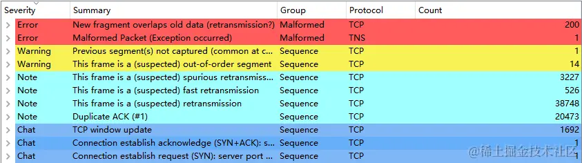 首先通过 Expert Information 快速浏览跟踪文件中的异常信息,有大量的疑似重传、快速重传和重传的信息,初步感觉像是有丢包问题。