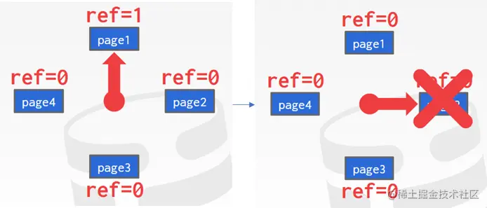 如上图所示,page1之前被访问过,所以ref是1,指针指到page1后将ref置为0,之后指到page0,发现page0没有被访问过,所以将page0替换出去。