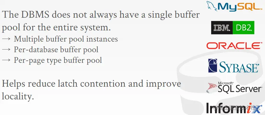 在很多DBMS中,并不是只有一个缓存池,而是对于每一个分类数据(元数据、索引、数据page)都有一个缓存池