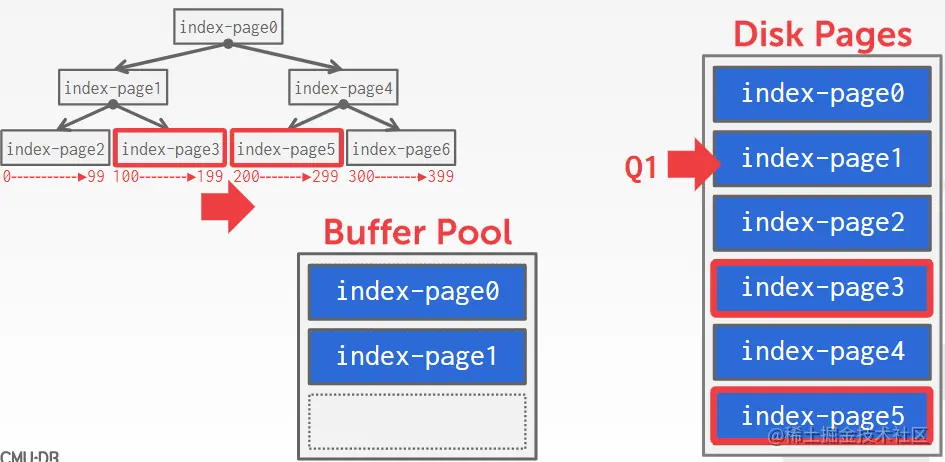 例如在以树作为page索引的DBMS,例如PostgreSQL用B树,MySQL用B+树。对page的查询到第二层时,第三层的page就已经能够知道预先可以载入哪些page了。在这里是page3和page5。