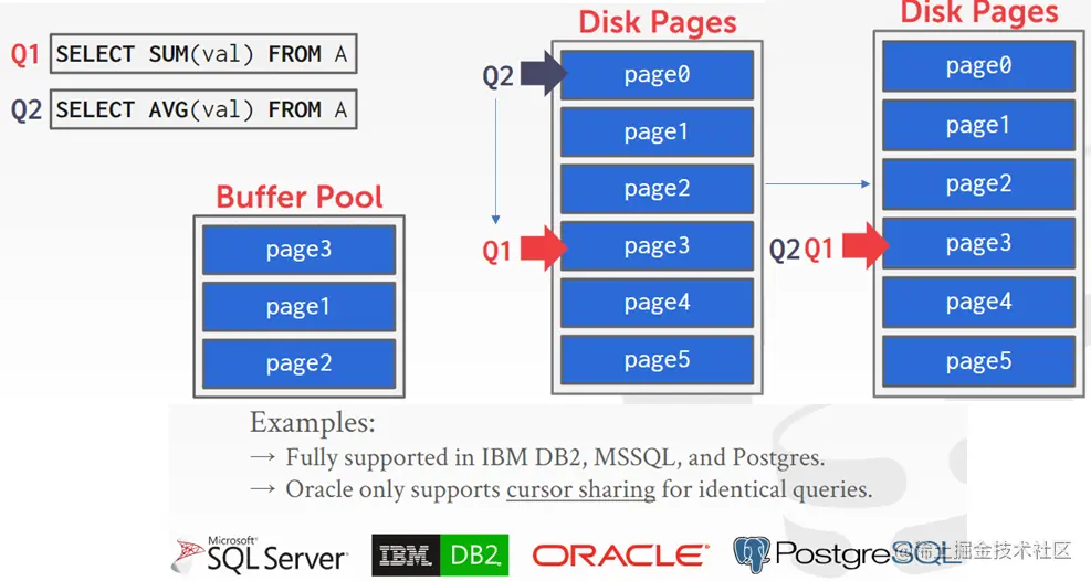 当查询语句有相似的扫描路径时,可以将多个查询路径合并为同一个,共用缓存池的数据。例如下面的Q1和Q2,都是全表扫描,因此Q2可以在Q1执行中间进行合并。