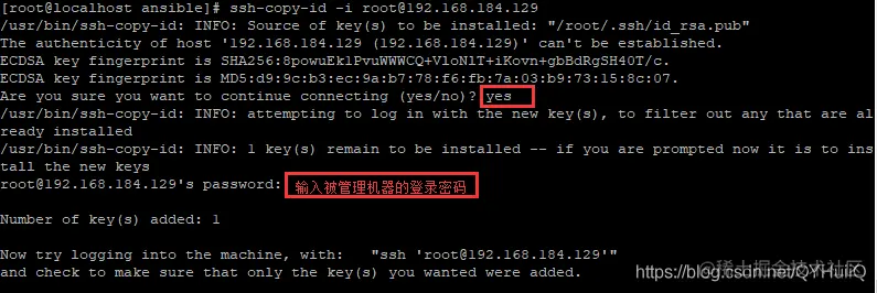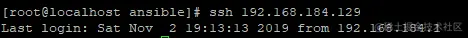 [root@localhost ansible]# ssh-copy-id -i root@192.168.184.129 #@后面跟的是被管理机器ip