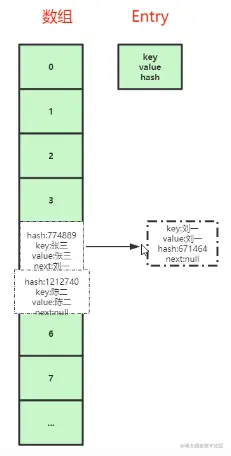 当key为刘一进来时,存储位置Index为4,那么就放在数组中下标为4的地方。接着陈二存放。到了张三时,存储位置又是4,但是索引为4的地方已经存了刘一,此时如果把张三直接放入索引为4的地方,就会把刘一覆盖掉。于是就出现了链表的方式来解决:将刘一向后移动一个位置,然后把张三放到索引为4的存储空间中,并修改张三的next指向刘一,形成一个单向链表。所以HashMap的底层数据结构是数组+链表。