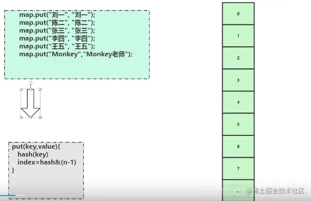 在调用put()时,其实执行的是先计算出key的hash值,再根据Hash值计算出Index决定了它存在数组中的哪个位置。