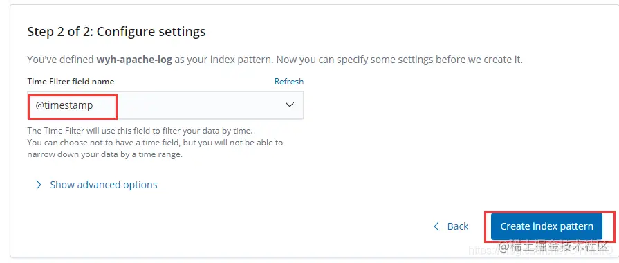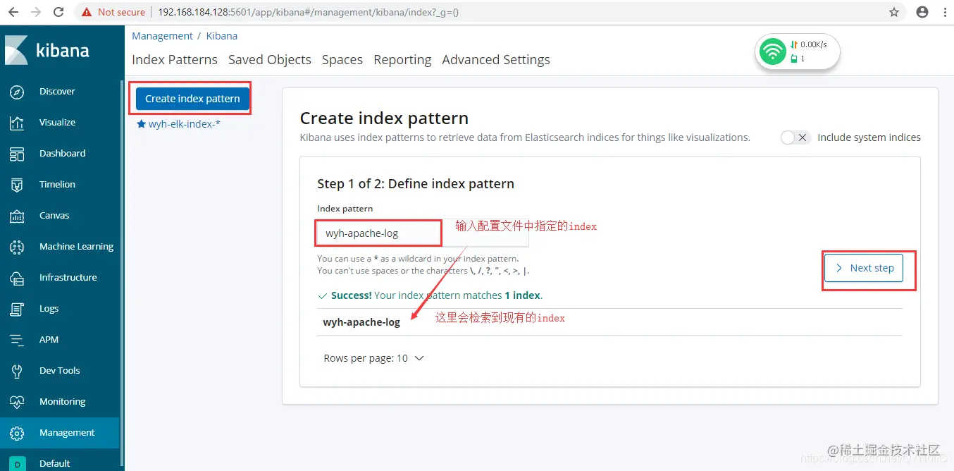 3.5在kibana中创建一个刚才在配置文件中指定的index: