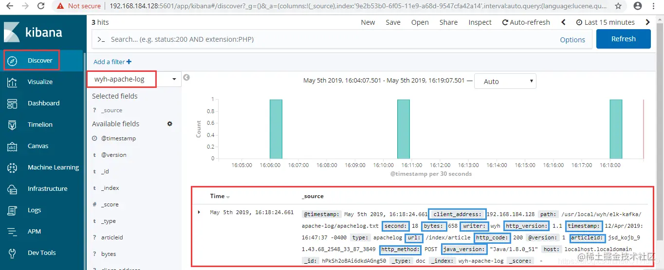 蓝色方框中的就是我们对Log解析之后的每一个属性的值,在elasticsearch中可以对这些属性进行操作分析等。