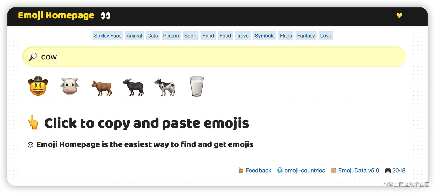 同样我们搜索 cow,可以看到这里给出的内容比 Emojipedia 更加全面!