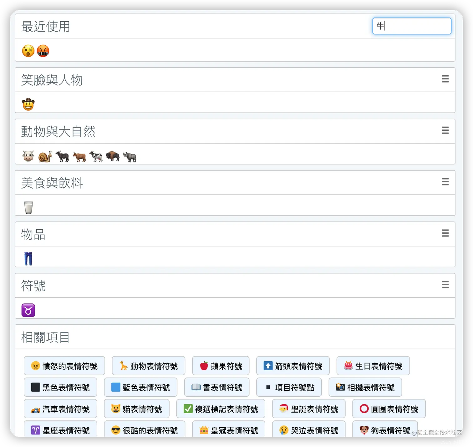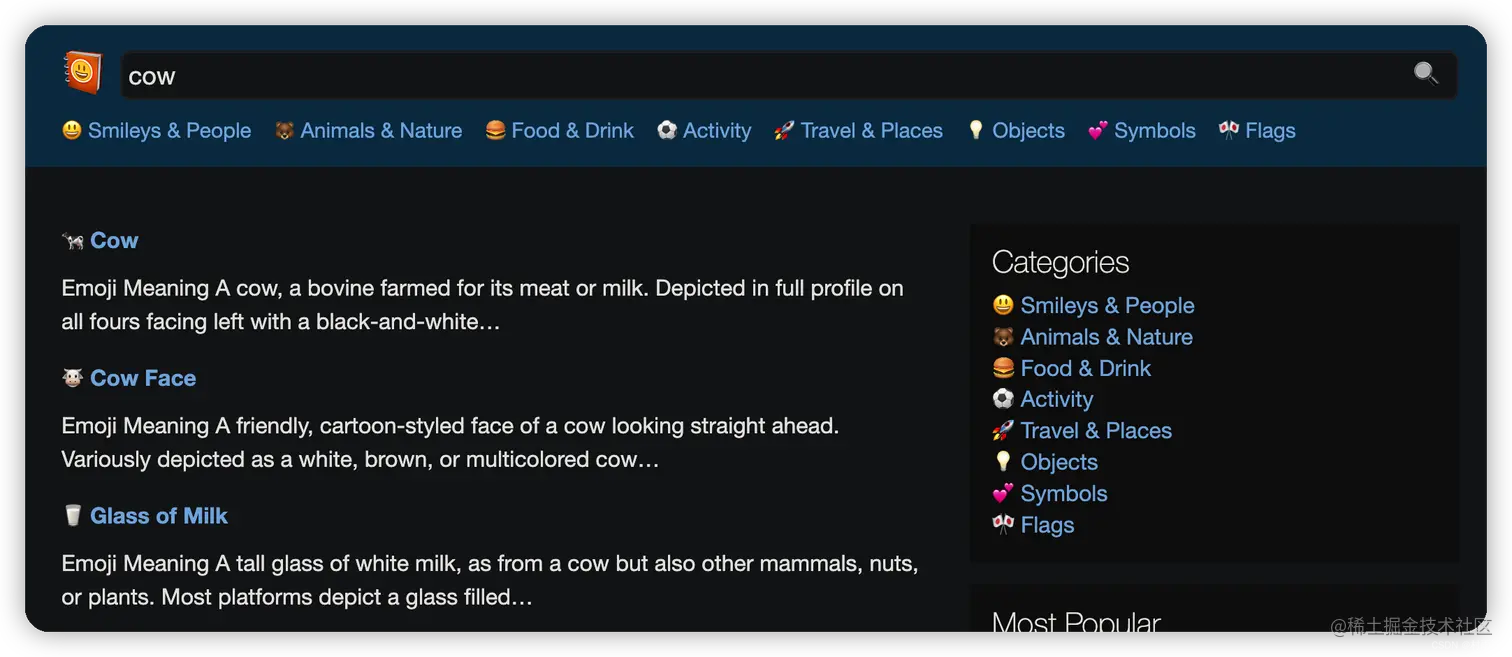 比如我们搜索 cow,就会给出牛相关的表情符号。