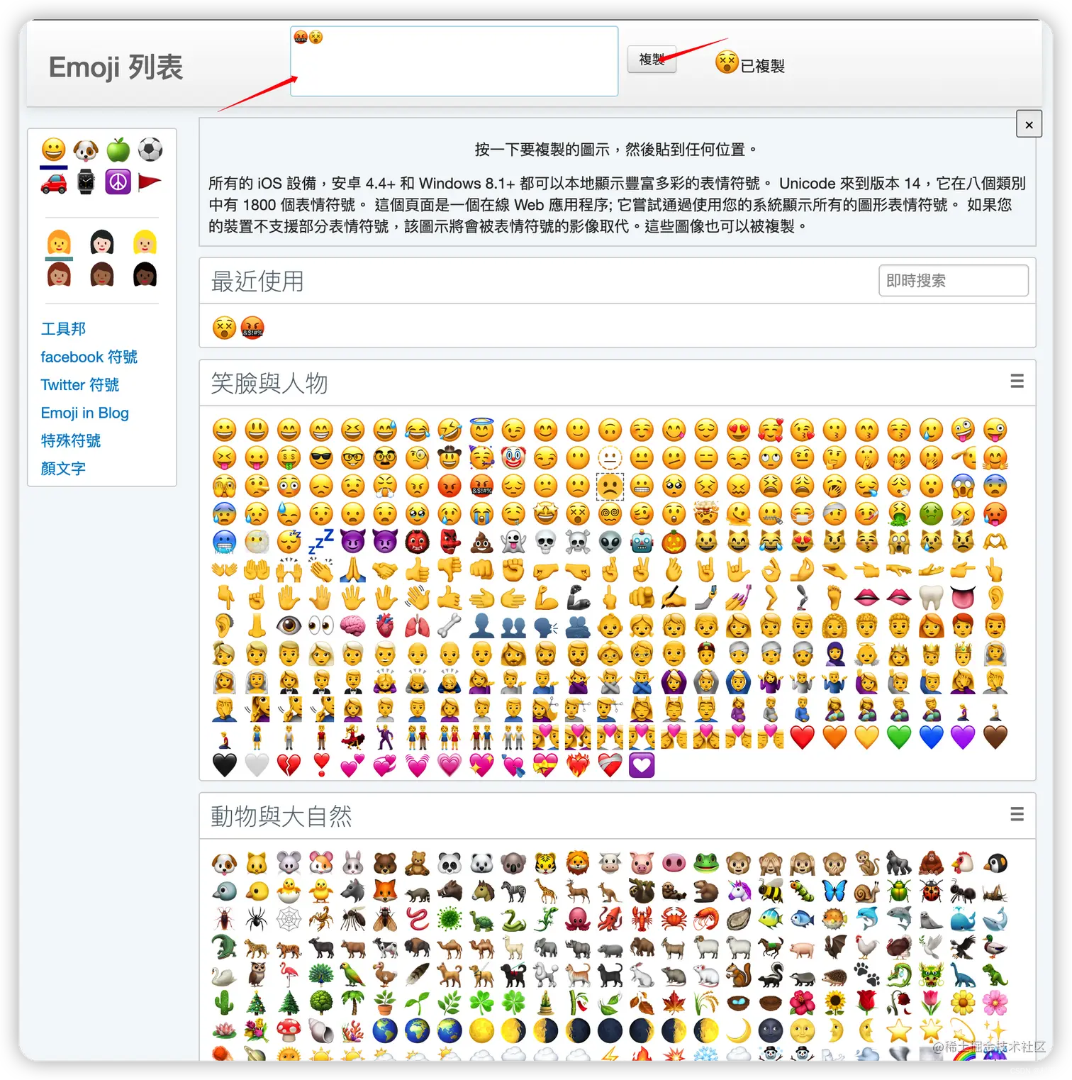 支持所有的 IOS、Android 4.4+ 和 Windows 8.1+ 系统,这里共分为 8 个类别,共含有 1800 个表情符号。我们可以通过点击下面不同类别中的表情符号,它就会自动到最上方的框中,然后点击右方复制按钮即可实现赋值!