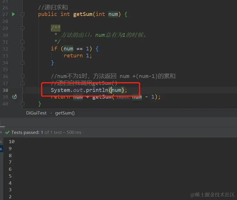 然后我们再来写个测试类,调用该getSum()函数,然后入参我们传10。
