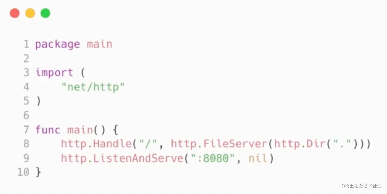 这段代码总共大概 10 行。其实总共核心代码只有两行。第 8 行是说在标准库的 HTTP 包里面内建的路由,把斜杠这个路由指向一个静态文件处理的实现。第九行是增添 8080 端口并且启动服务器,就实现了一个可以承载静态文件访问的支持高并发、高性能的服务器。