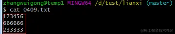 然后,在lianxi目录下创建一个文件,这里我创建的文件为0409.txt,内容为123456