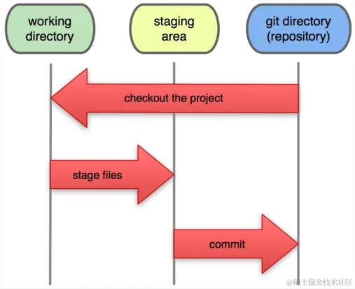 安装好之后,在使用前先来了解一下Git的工作原理,是很有必要的一件事,下面是Git的工作流程和简化原理图: