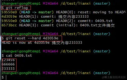 可以看到内容已经回退到上一个版本,通过git log查看修改记录,发现最近的一次233333内容的记录已经看不到了,如果想回到最新的版本,可以通过如下命令进行回退: