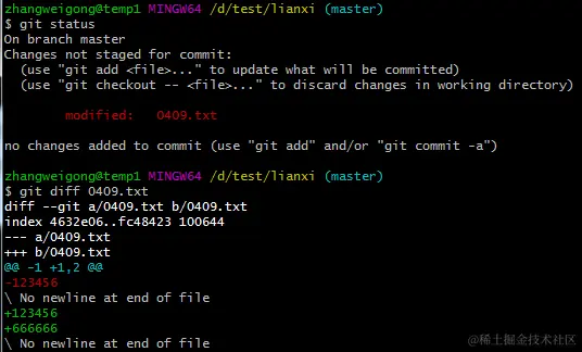 修改文件后,通过命令git status发现,文件已经被修改,但是未提交,如果要检查文件修改了什么内容,可以通过上图中的命令来查看,发现文件的第二行增加了666666的内容。
