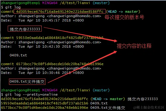 git log --pretty=oneline:使记录只显示主要的内容,一行显示