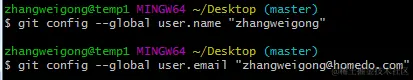 PS: 注意git config --global参数,有了这个参数,表示你这台机器上所有的Git仓库都会使用这个配置,当然你也可以对某个仓库指定的不同的用户名和邮箱,根据个人情况设置。