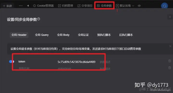 实际开发中同一个项目的一批接口一般都有一些公共的请求参数。比如常见的token参数,项目下的每个接口(除登录接口外)请求时都需要在head中带上token参数,如果我们在每个接口上添加就太麻烦,这时候我们就可以设置一个全局的token参数。