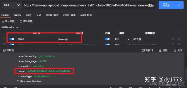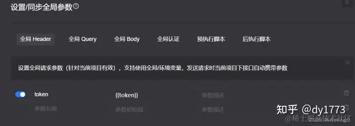 需要使用全局变量时则需通过占位符{{token}}来接收这个全局变量的值,既可以在单个接口的请求头中设置,也可以在全局参数中进行设置。