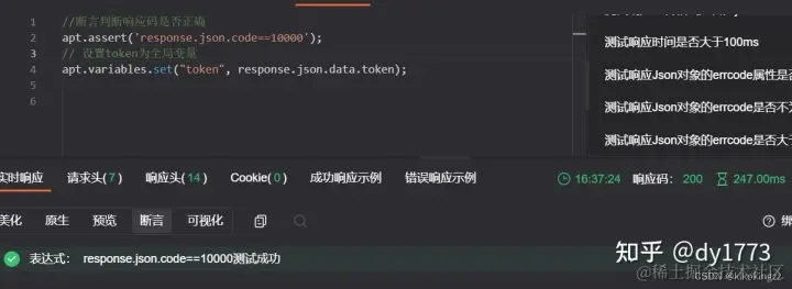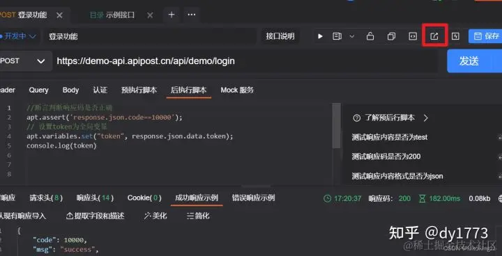 后执行脚本原理上与预执行脚本一致,不同的是它是在接口请求之后执行的。它主要用于设置断言脚本以验证测试用例。同时它还可以用于接口参数依赖的场景,比如业务接口需要获取登录接口返回的token,这时候就可以在登录接口的后执行脚本中获取接口响应的token,并设置token为全局变量。