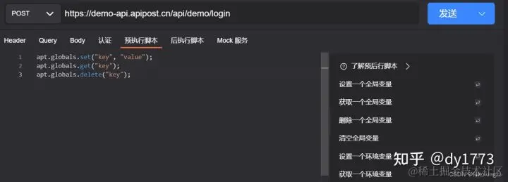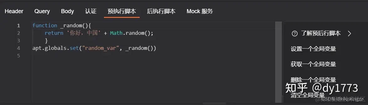 预执行脚本是一个接口请求发送前执行的脚本。我们可以通过预执行脚本执行 编写JS函数实现复杂计算;定义、获取、删除、情况环境变量以及全局变量;获取请求参数;动态添加、删除一个header、query,body请求参数等一系列操作。