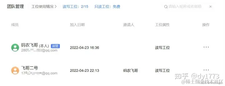 邀请完成之后就可以在团队管理里看到被邀请的协作人员。被分配的协作人员权限可以是读写权限(读写工位),也可以是只读权限(只读工位)。